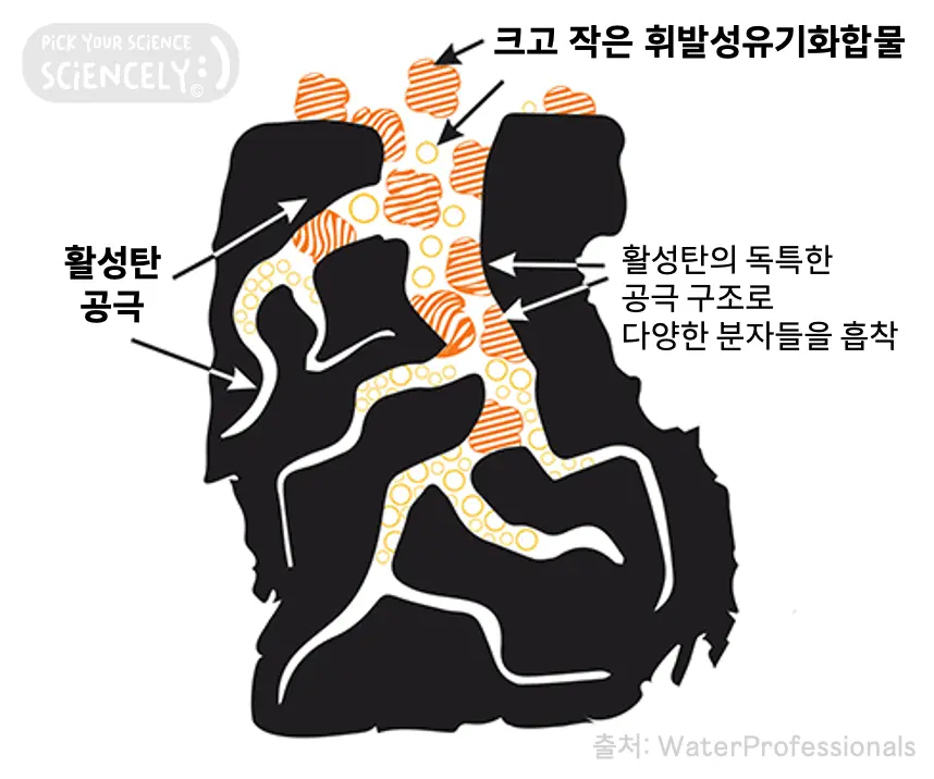 카본필터는 약한 분자간 인력인 반데르발스 힘을 통해 오염물질을 활성탄의 공극으로 흡착시킵니다. 카본필터는 악취의 원인이 되는 포름알데히드 같은 휘발성유기화합물(VOC), 염소, 탄닌(tannin), 페놀(phenol), 클로라민(chloramine), 황화수소(H₂S) 등을 효과적으로 포착하며, 소량의 철, 수은 등의 금속 또한 어느 정도 잡아냅니다. 그러나 포착하지 못하는 물질이 분명히 존재하는데 질산염, 아질산염, 암모니아, 불화물, 나트륨, 중금속, 탄화수소, 미생물(박테리아, 바이러스³, 원생생물) 등은 걸러내지 못합니다. 카본필터는 공기청정기 외에도 마스크, 커피 디카페인 과정, 금 채집 등에 사용되며, 탈취 능력이 뛰어나 식수 정화에 많이 사용됩니다.
