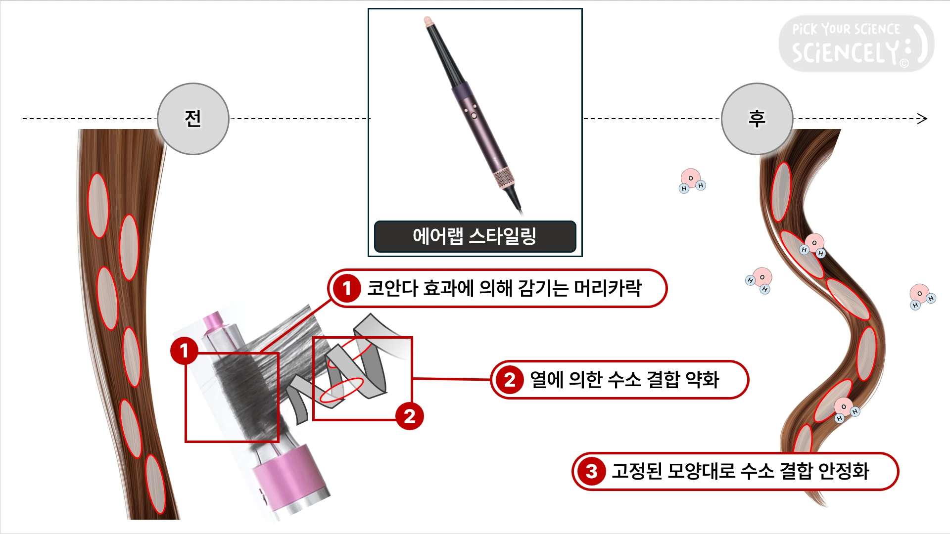 - [에어랩에 의해 고르게 열을 가함] 열에 의해 기존의 머리카락 속 수소 결합이 약해짐