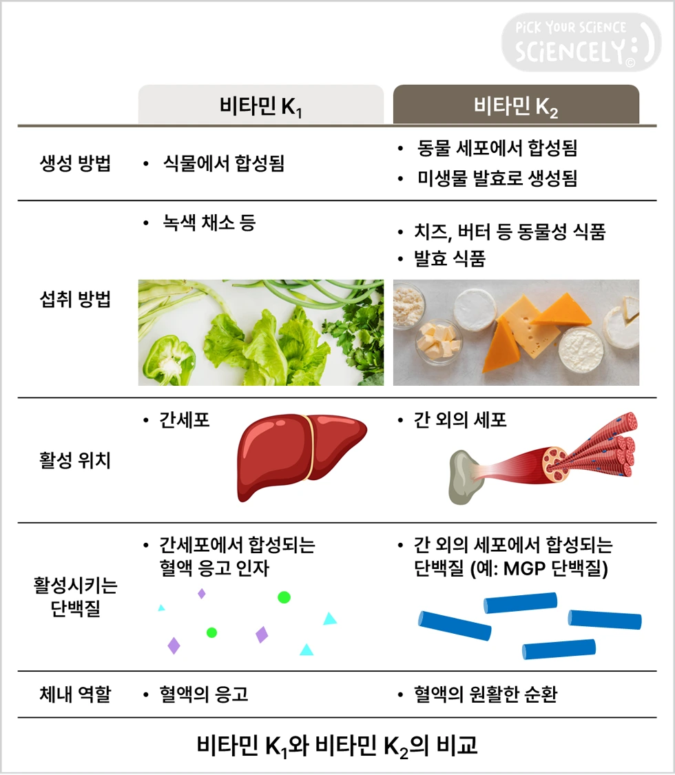 | 섭취 방법 | 녹색 채소 등 | 치즈, 버터 등 동물성 식품 / 발효 식품 |