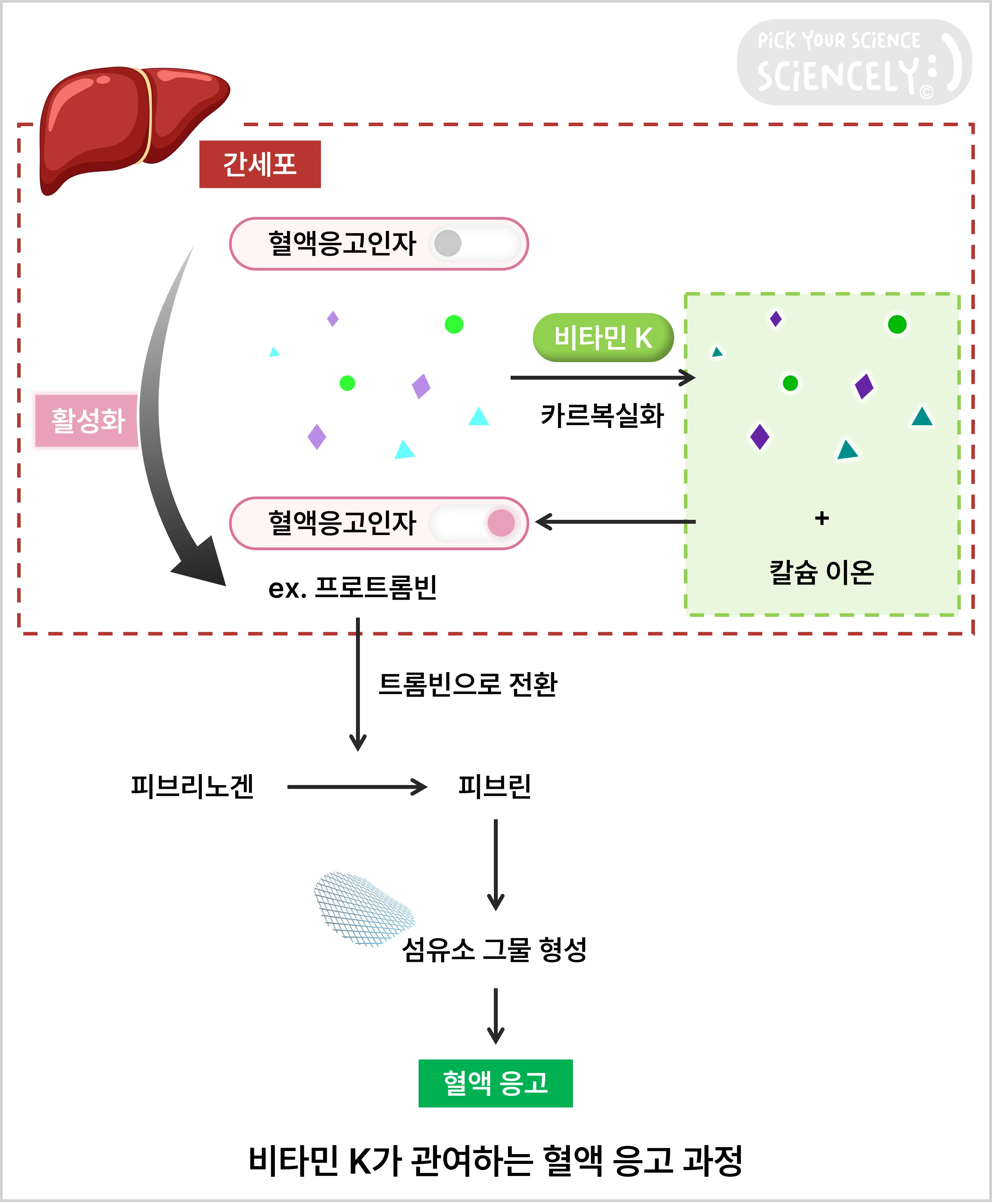 정리하자면, 비타민 K는 혈액 응고 인자를 활성화시켜 혈액 응고가 가능하게끔 하는 역할을 하는 것입니다.