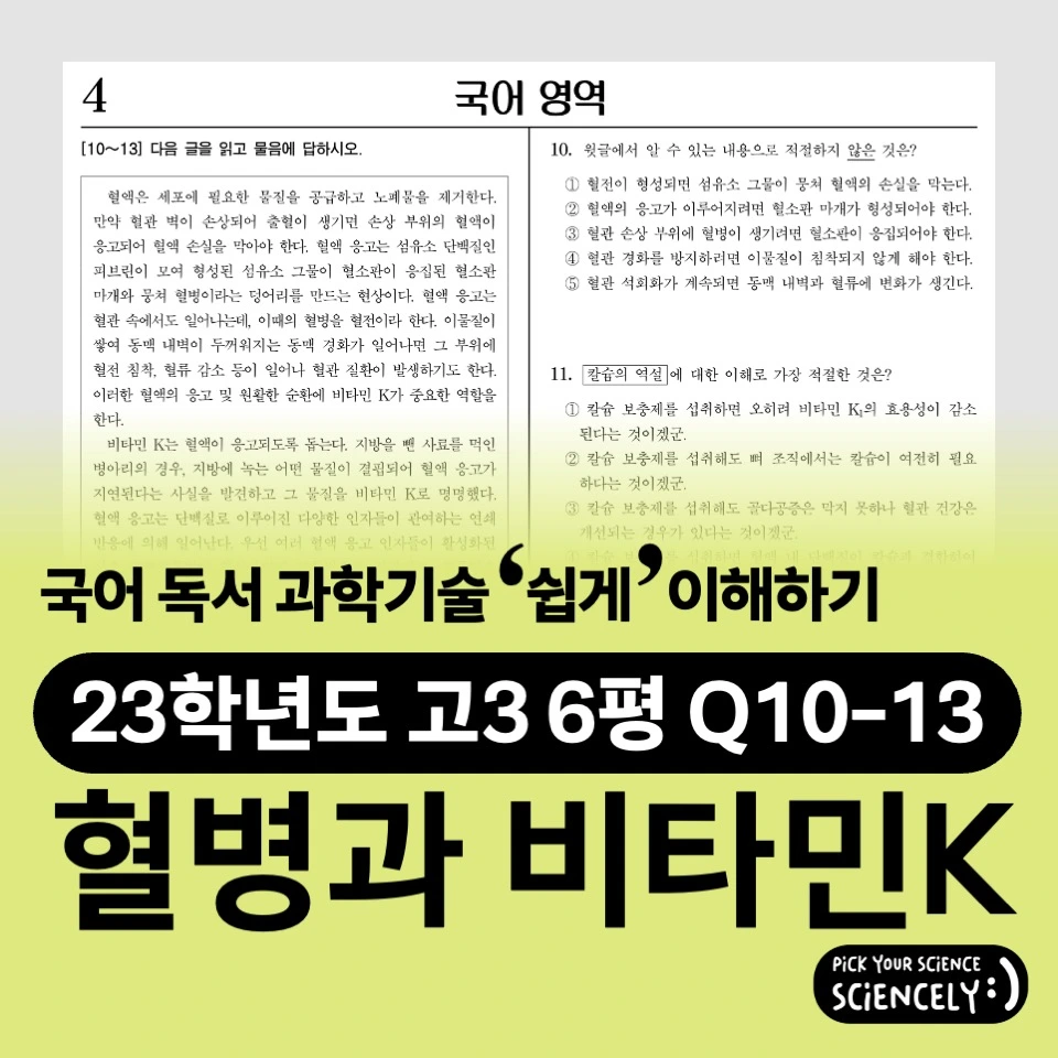 2023학년도 고3 6평 국어 지문 속 비타민K, 혈액 응고, 혈병, 카르복실화를 설명합니다. 잘 와닿지 않아 어려웠던 과학기술을 쉽게 이해해 보세요 :) 목차2023학년도(2022년 시행) 고3 6평 국어 Q10-13 혈병과 비타민K 비타민 K는 (1) 혈액의 응고와 (2) 혈액의 원활한 순환에 중요한 역할을 함 (1) 비타민 K와 혈액의 응고혈액 응고 인자는 비타민 K-의존성 단백질로, 간세포에서 합성되어 비타민 K에 의해 활성화됨 (→ 비타민 K₁)활성화된 프로트롬빈(혈액 응고 인자의 일종)은 혈병을 만드는 섬유소 단백질 피브린을 형성하는 작용을 함(2) 비타민 K와 혈액의 원활한 순환MGP 단백질 역시 비타민 K-의존성 단백질로, 혈관 근육 세포에서 생성되어 비타민 K에 의해 활성화됨 (→ 비타민..